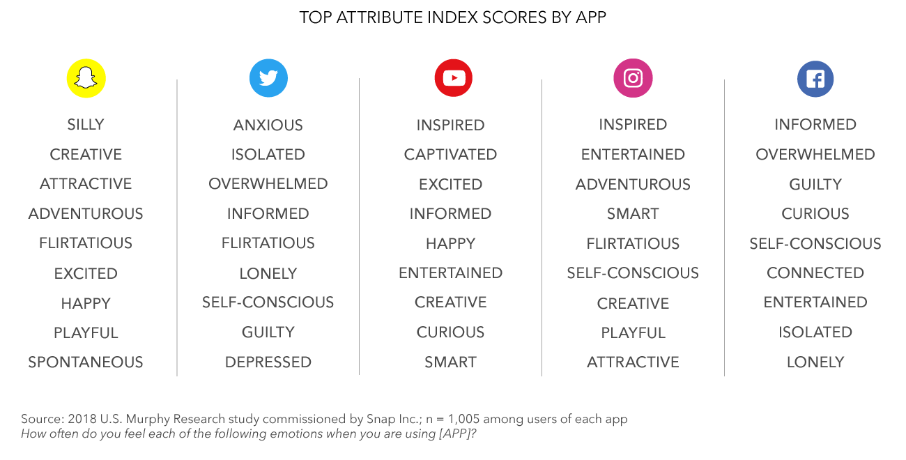 The report shows plenty more information around why, how when and where people use Snap, and also Twitter, YouTube, Facebook and Instagram. This is a really useful read for brands to reconsider the platforms they are using. Are these really the best ones to be focusing on? Is there a better option out there? Which feelings do they want to be associated with their content? For example, Facebook makes some people feel informed. If your brand is about informing your audience, it’d be bizarre if you didn’t have a presence on Facebook or Twitter.