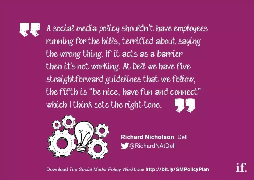 11. Clarity is key. Make sure that you define who your policy applies to and who it does not. This will mean regularly reviewing and updating your document, especially as social continues to grow and evolve throughout the organisation