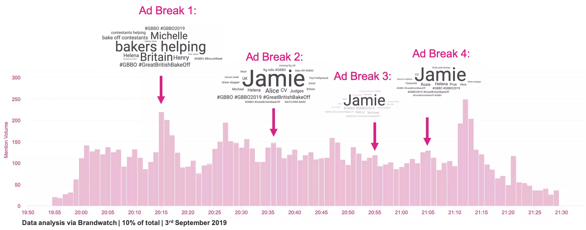 Let’s start with looking at what happens during the advertising breaks. Whilst we see an uplift on social during breaks (nothing beats the spikes when something interesting happens). What’s interesting though is that there is little to no mention of any of the advertising. ebay, Dr Oetker and Kinder get a few mentions, and the Amazon Echo bumpers manage 2 mentions across the whole episode.