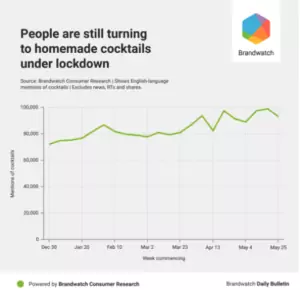 While we can’t visit pubs and bars, people have been using their extra time to try out new drinks, too – according to Brandwatch, there were 103k mentions of cocktail recipes on social between March and May, +71% compared to the previous three months.