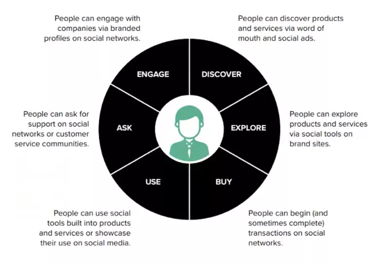 - Explore: people can explore products and services via social tools on brand sites