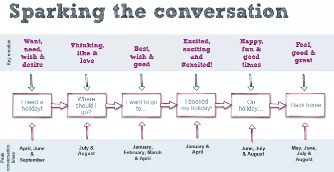 Two things become immediately apparent when looking at the information displayed above – firstly, the emotions and keywords that are used throughout the purchase journey are largely positive and secondly, behavioural triggers in travel are (unsurprisingly) seasonal.