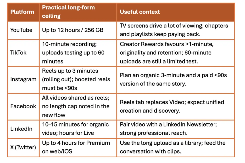 - LinkedIn is built for deep content from the get‑go: organic video posts support up to 10–15 minutes, and newsletters now exceed 500m subscriptions.