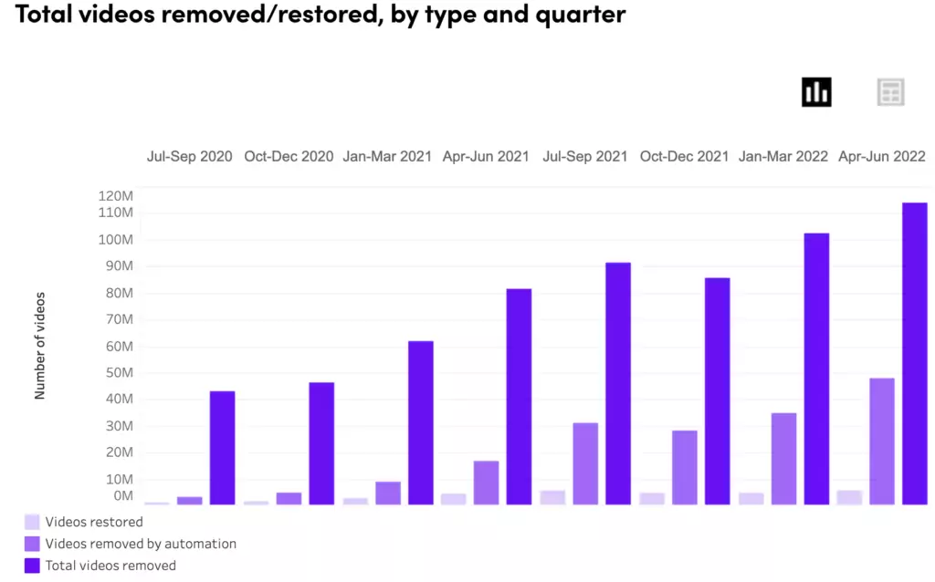 It looks like the social platform took down over 113 million clips between April and June this year due to policy violations or other issues – that’s an 11% increase from the previous quarter. The chart follows a steadily increasing trend over time, which isn’t surprising, given the app’s continued growth. Of course, TikTok is making efforts to improve its terms to protect users from potentially harmful exposure in the app. However, it’s still difficult to avoid fraud and misinformation.