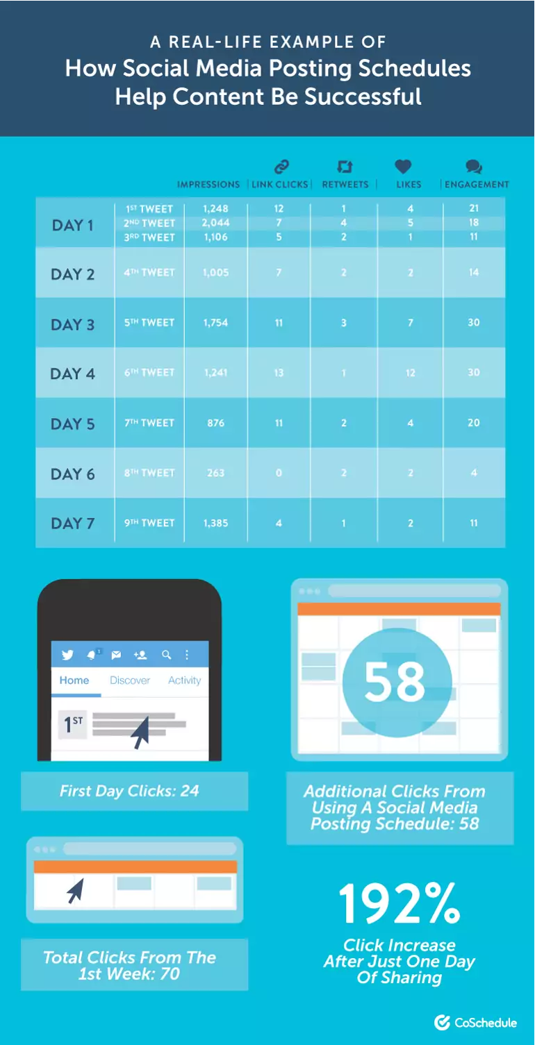 Do: Social feeds are busy places, and there’s a good chance that if you only share your post once, your audience will miss it. Audiences won’t care if they see the same thing twice, in fact, they may need to see it a few times before they click through. Moreover, if you’re shattering content in the way we recommended above – they’ll see a different variant of your content’s message. CoSchedule did a great job of highlighting the benefits of resharing, see below and let the numbers speak for themselves: