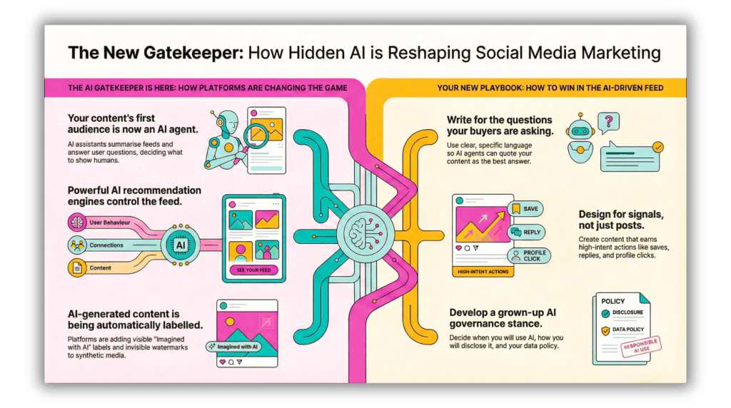 That means your job is shifting from “how do we get this post in front of people” to “what questions do we want to be the answer to, and what does our content need to look like so the AI chooses us”.