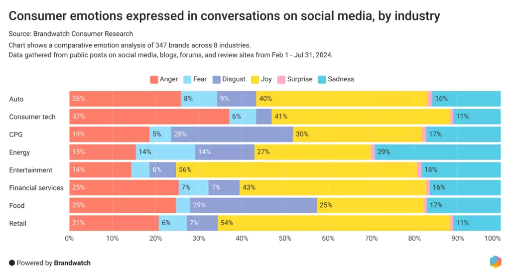 Entertainment brands are sitting pretty with about 50% of mentions filled with joy. No shocker there—who doesn’t love a good movie or binge-worthy TV show? Retail brands are doing even better, with 54% of their mentions being happy. Awesome deals and great customer service—it’s all working to bring those good vibes.