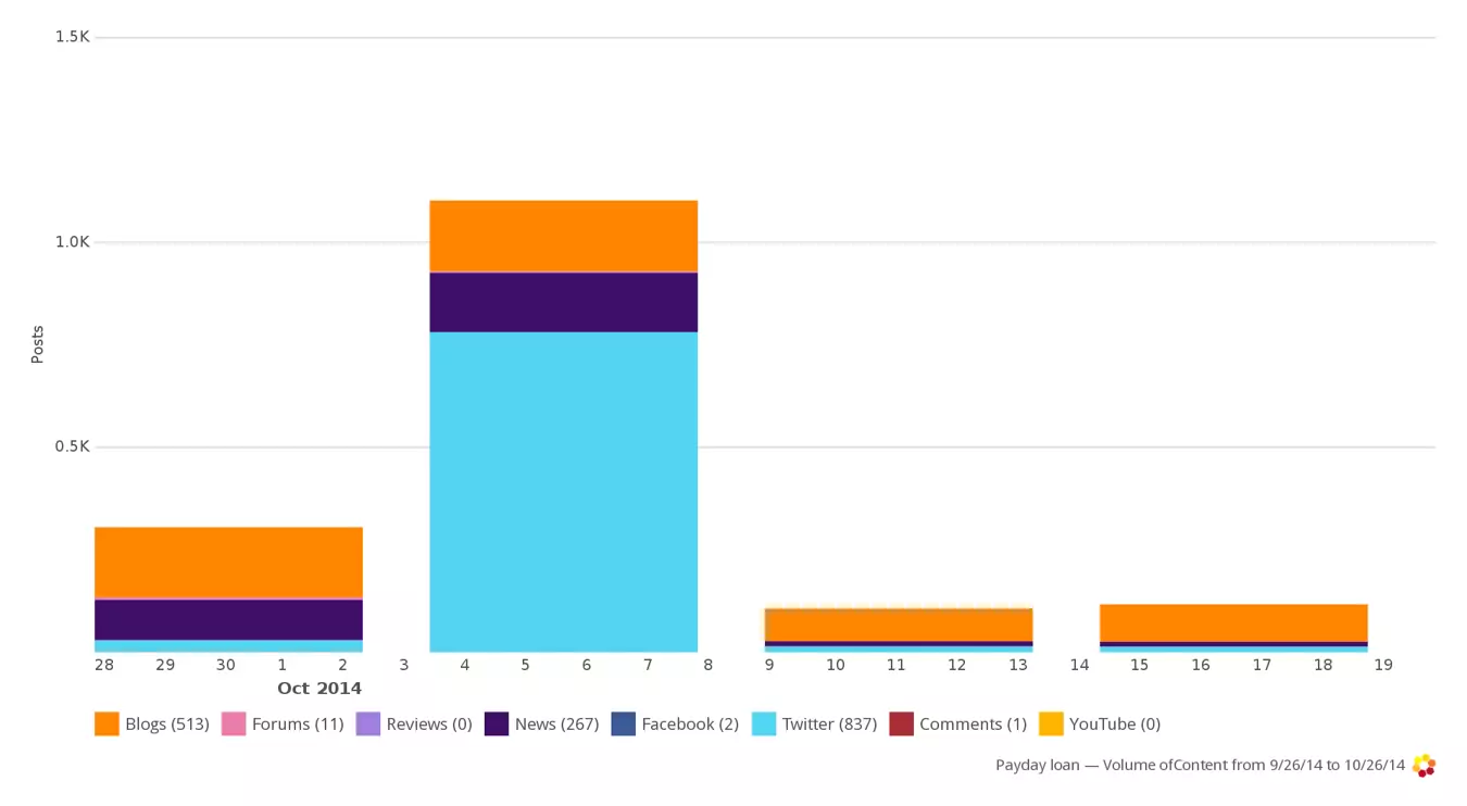 We recently took a deeper look at the conversations around payday loans. Obviously, a subject that people get passionate about. Looking at the spread of conversations across the networks though, we see an interesting pattern. One that shows that the usual, everyday, conversations happen in blogs. However, Twitter spikes dramatically when news breaks on a payday loan issue – either in the press or on TV. It is this pattern that allows brands to plan social engagement and minimise reputational risks.